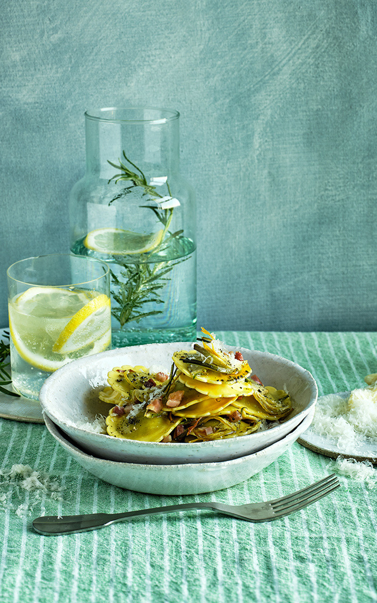 Girasoli Pesto Basilic & Pignons, artichauts frits, bacon croustillant et pecorino