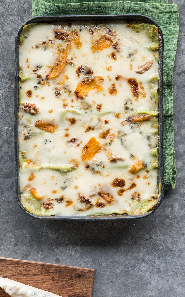Beurrez un plat allant au four et étalez un voile de béchamel sur le fond ; déposez une feuille de lasagne épinards ; recouvrez d'une couche de potiron, de quelques morceaux de gorgonzola, de quelques éclats de noix et d'une couche de béchamel ; répétez les couches jusqu'à épuisement des ingrédients. Après avoir disposé la dernière couche de lasagne, mettez quelques tranches de potiron, 2 ou 3 morceaux de gorgonzola et 2 ou 3 cerneaux de noix hachés, recouvrez le tout de béchamel et saupoudrez de parmesan râpé.