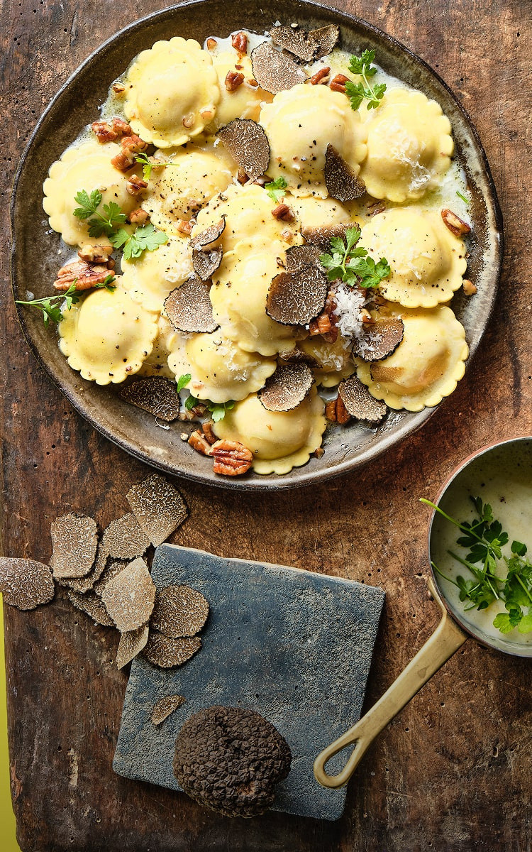 "RAVIOLI ASPERGES & PARMIGIANO REGGIANO, NOIX DE PÉCAN ET TRUFFE NOIRE "