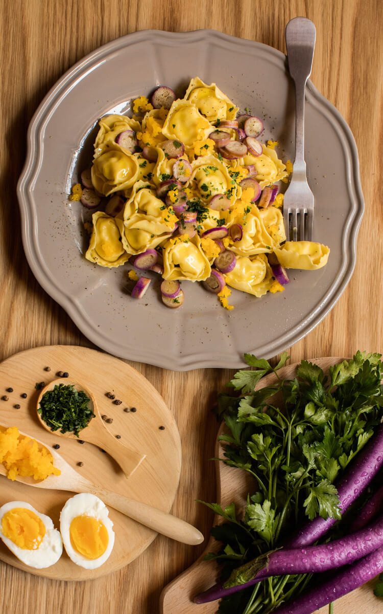 Ravioli tomate & mozzarella avec un œuf mimosa