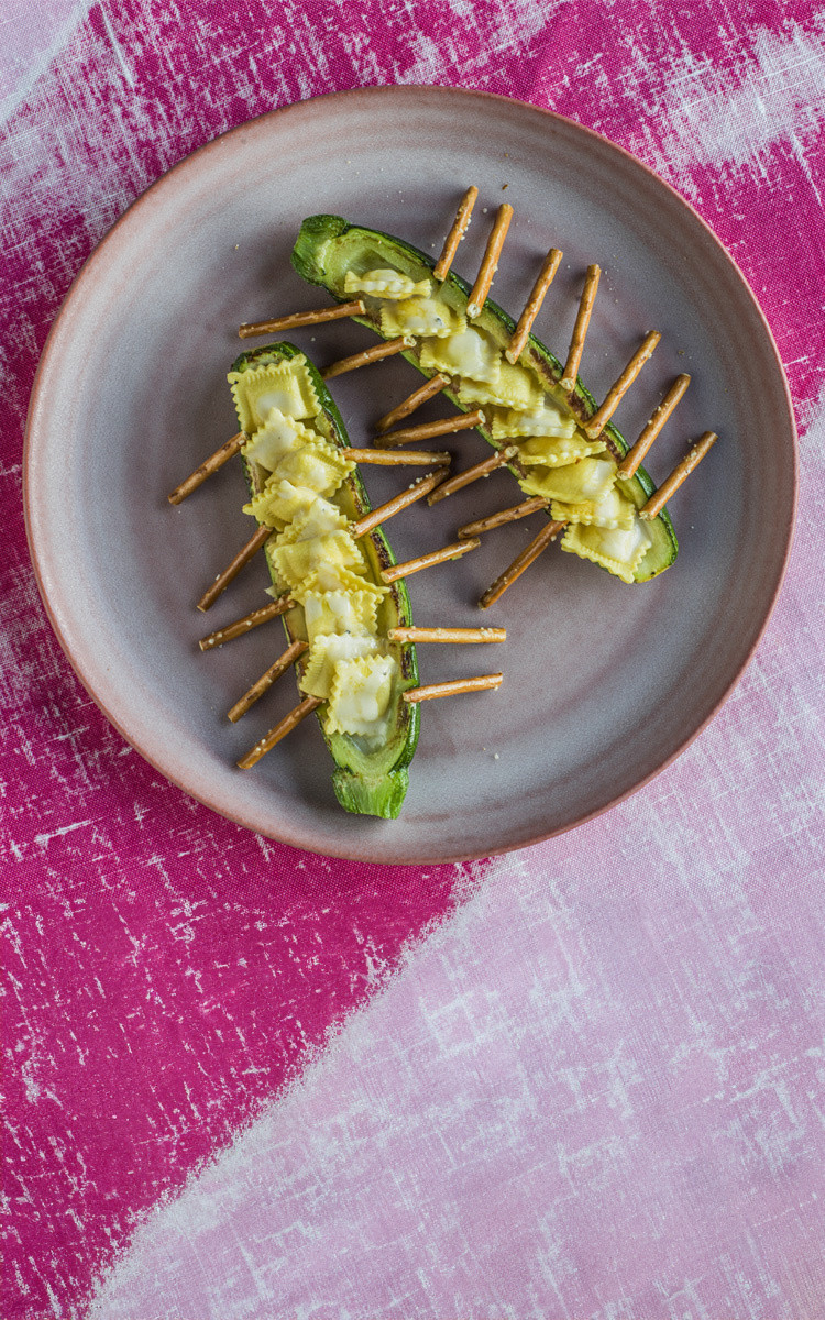 5) Egoutter les pâtes et les disposer à l’intérieur de la courgette comme si elles étaient des rameurs