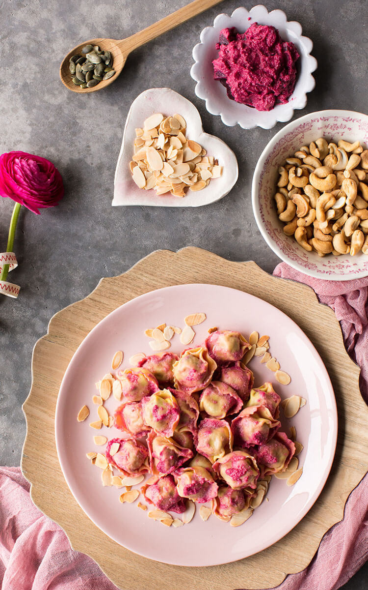 Tortellini bacon, mozzarella & speck AU PESTO DE BETTERAVE ET D’AMANDES